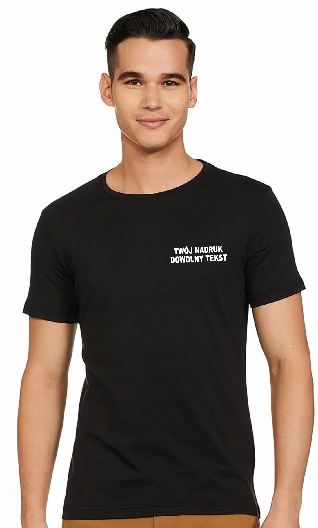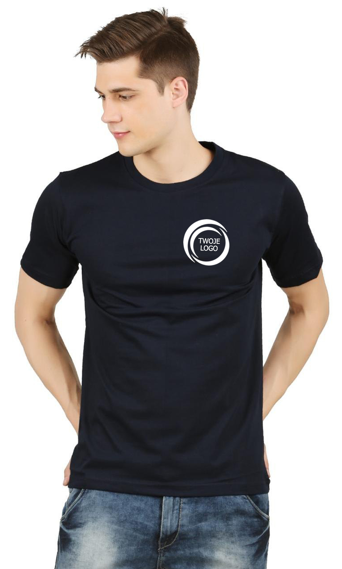 Oferta obejmuje t-shirt z jednokolorowym nadrukiem twojego logo lub dowolnym tekstem na lewej piersi koszulki.
